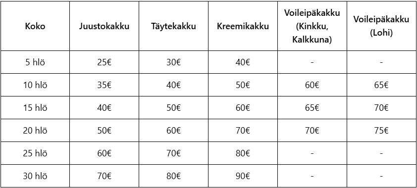 Voit tilata kauttani kakkuja erilaisiin tilaisuuksiin, ja räätälöin jokaisen tilauksen mielelläni asiakkaideni toiveiden mukaan. Olipa mielessäsi perinteinen suklaakakku, värikäs lasten syntymäpäiväkakku tai herkullinen gluteeniton vaihtoehto, autan sinua toteuttamaan sen.